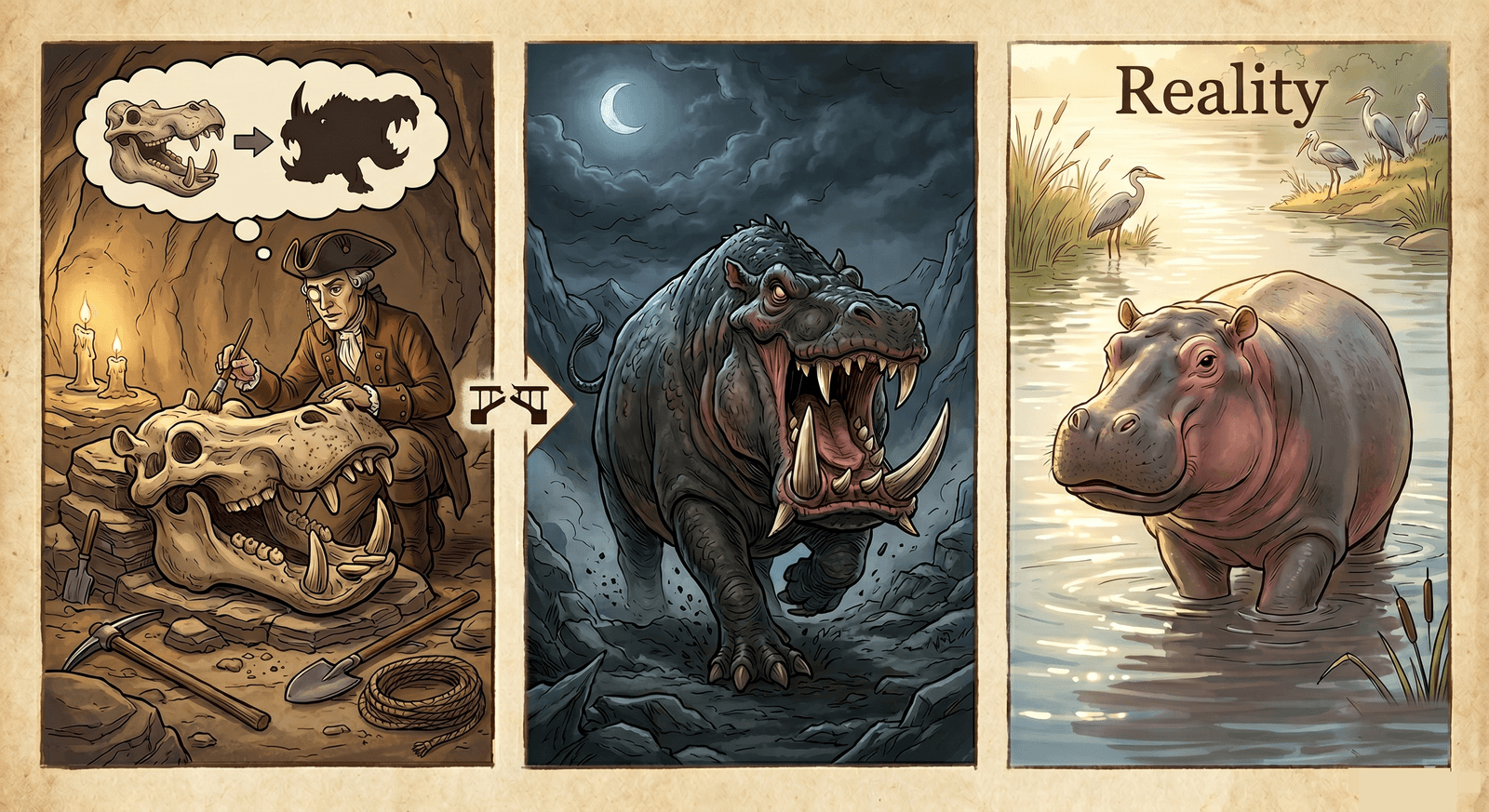 Imagine this: A paleontologist finds a hippo skull in a region where hippos haven't lived for thousands of years. She writes a careful paper about some kind of swamp predator. Big teeth, long jaw, the kind of thing locals must have feared.